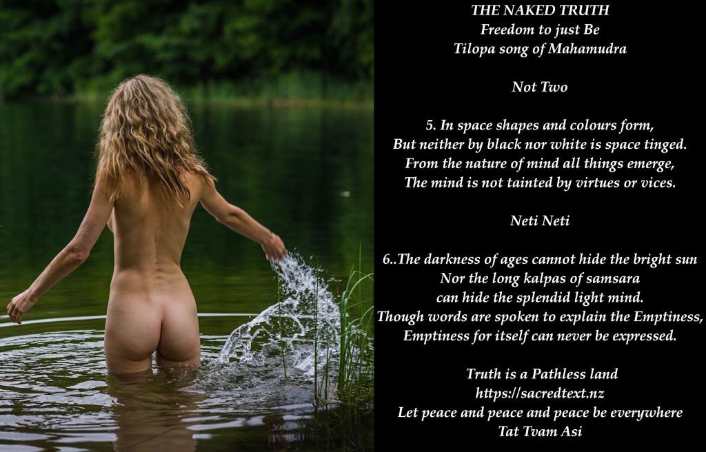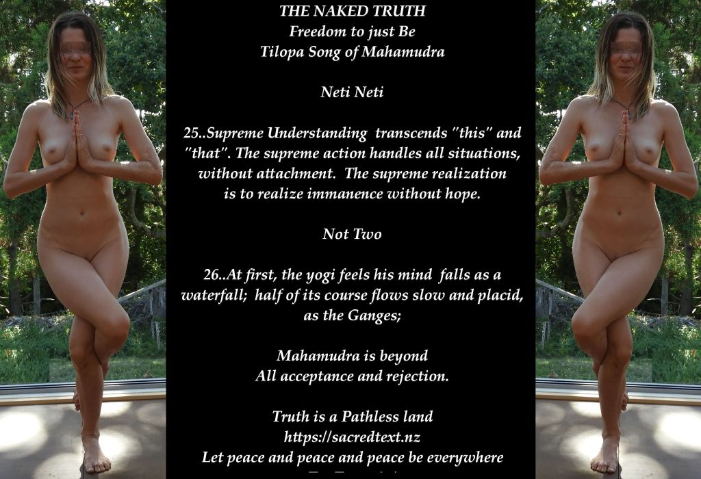 "Clad. In her absolute, primordial nakedness she is free from all covering of "Illusion". She is Nature (Prakriti in Sanskrit), stripped of 'clothes'. It symbolizes that she is completely beyond name and form, completely beyond the illusory effects of "Maya" (false consciousness). Her nudity is said to represent totally illumined consciousness, unaffected by maya. Kali is the bright fire of truth, which cannot be hidden by the clothes of ignorance. Such truth simply burns them away. " |